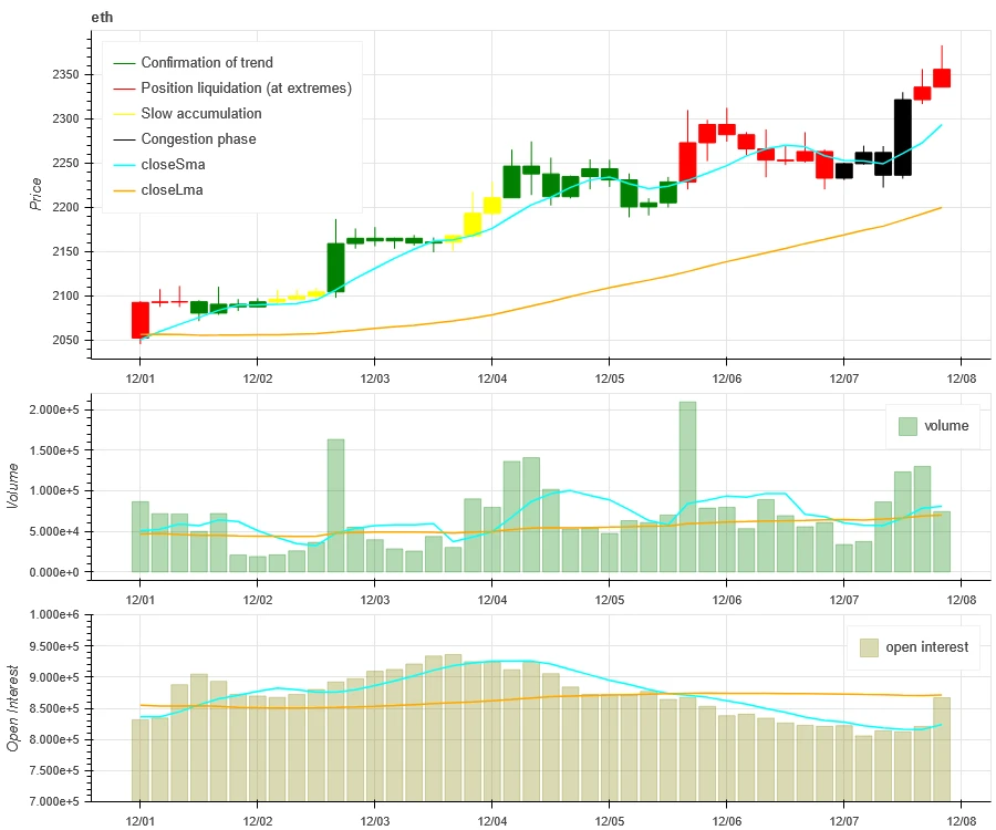 上图最上方 ETH 的价格走势,中间是成交量、最下方是未平仓量、浅蓝色是 1 天均值,橘色是 7 天均值。其中 K 线的颜色代表当前的状态,绿色是价格上升有成交量支持,红色是在平仓,黄色是在缓慢累积仓位,黑色是拥挤状态。