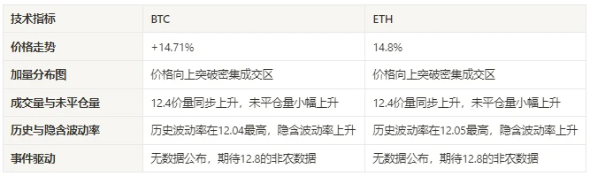 过去一周 BTC 与 ETH 都在 12.4 放量启动上涨行情, 12.5 号成交量最大;未平仓量从高位下降后回升。