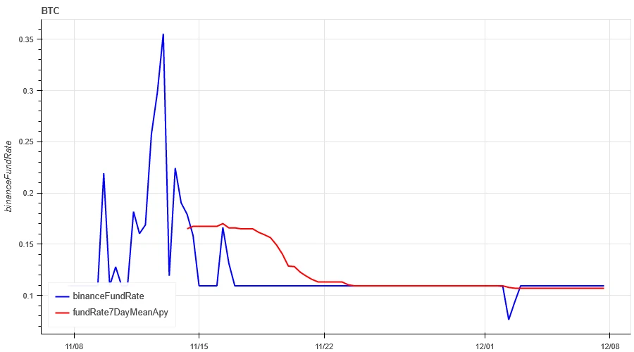 蓝色线为币安上 BTC 的资金费率,红色线为其 7 日平均