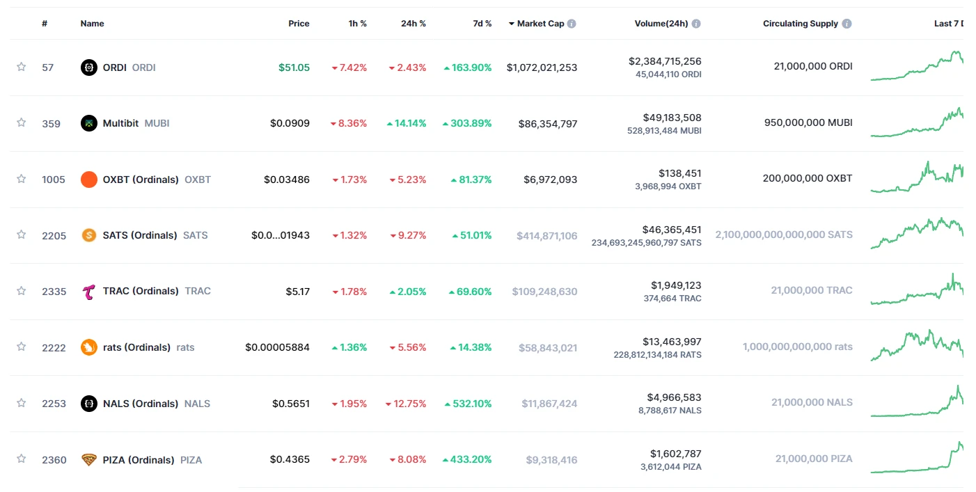 BTC 过去一周涨幅 11% ,遥遥领先纳指与黄金等美元资产,BRC 20 由于铭文的热度更是涨幅惊人,其中龙头 ORDI 在过去 7 天涨幅到达 163.9% ,市值已到 10 亿美金。