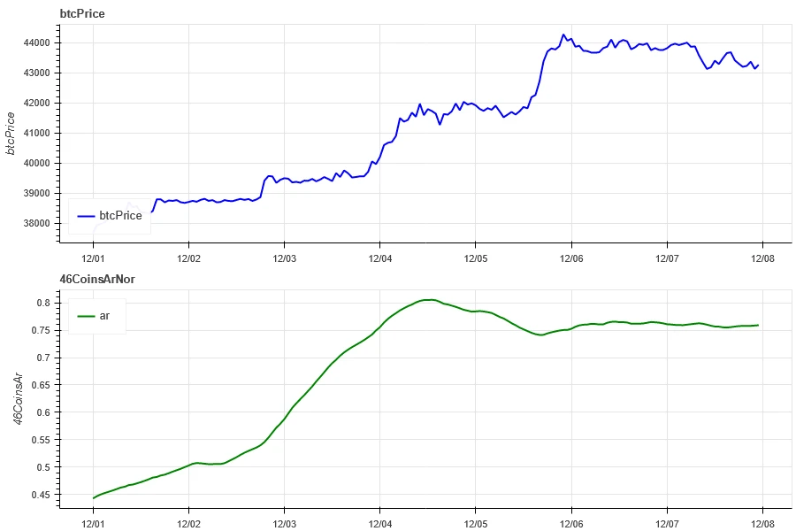 上图蓝色先为比特币价格,绿色线为['btc', 'eth', 'bnb', 'ltc', 'bch', 'doge', 'matic', 'sol','link','uni', 'enj','gala', 'mana', 'axs', 'dydx', 'fet' ,'gmx', 'xlm', 'xrp', 'ada', 'trx', 'sol', 'dot', 'avax', 'shib', 'atom', 'xmr', 'etc', 'ldo', 'hbar', 'apt', 'vet', 'qnt', 'vet','crv', 'aave', 'algo', 'ftm', 'ape', 'neo', 'sand', 'eos', 'xtz', 'rndr', 'theta', 'mkr']整体的相关性