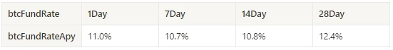 过去一周 BTC 资费平均年化收益为 11% ,合约杠杆情绪持续走平。