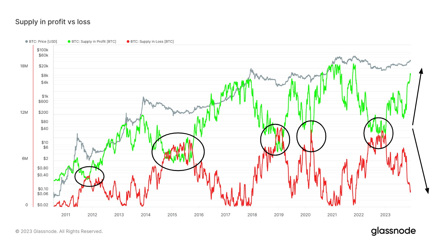 利润和亏损的趋同是比特币周期触底的标志,这种现象在熊市期间反复出现,特别是在2015年、2019年、2020年、2021年和2022年。