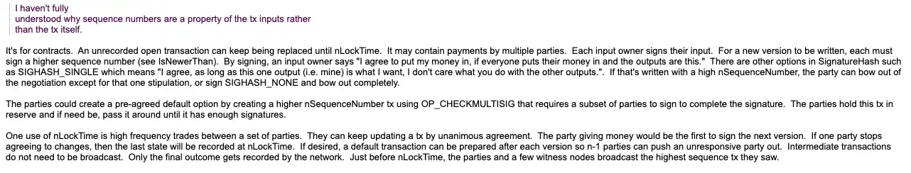 他给中本聪 发去邮件 ,询问:「我还没有完全理解,为什么序列号是 TX 输入的属性,而不是 TX 本身呢?」