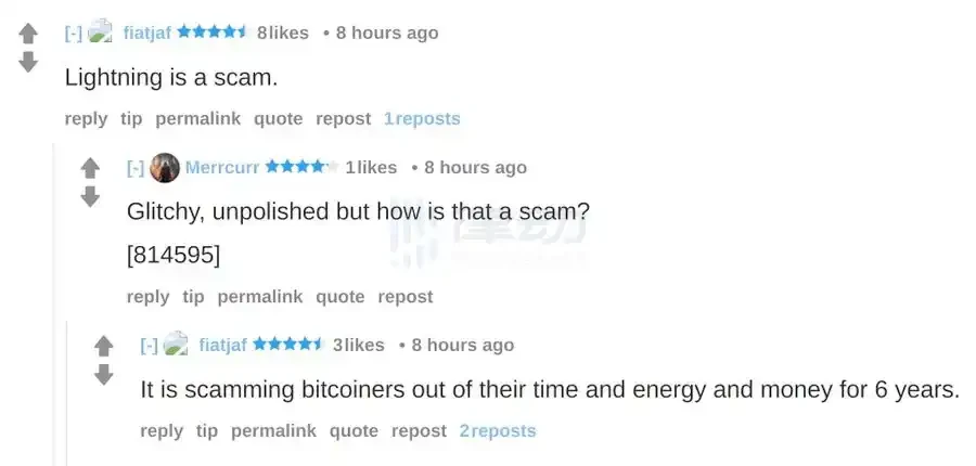 「从 2017 年开始,无数投资商,包括个人投资者、家庭办公室和风投都投资了闪电网络,他们不能让自己的投资归零。」Mike Yeung 对 BlockBeats 说道。同时一些有影响力的人物,包括 Twitter 前 CEO 和 MicroStrategy 的领导层,他们将自己的公共形象和公关策略与闪电网络的品牌紧密联系在一起。由于他们之前的公开支持和公司的性质,他们难以轻易撤回之前的言论。这导致他们不得不持续推广闪电网络的优点,尽管他们认识到其存在的局限性,且可能不是比特币扩容问题的终极解决方案。