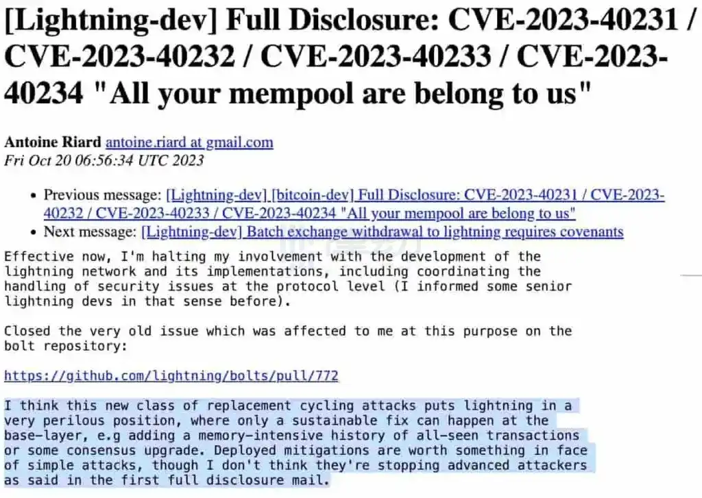 10 月 16 日,闪电网络安全研究员和开发人员 Antoine Riard 在 一封邮件 中,深入探讨了闪电网络通道所面临的资金丢失风险,这些风险主要是由于交易池的替换循环攻击问题引发的。他特别提到了一种影响闪电网络通道的交易中继干扰攻击,这在实践中是完全可能的,即使没有网络交易池拥堵也可能发生。