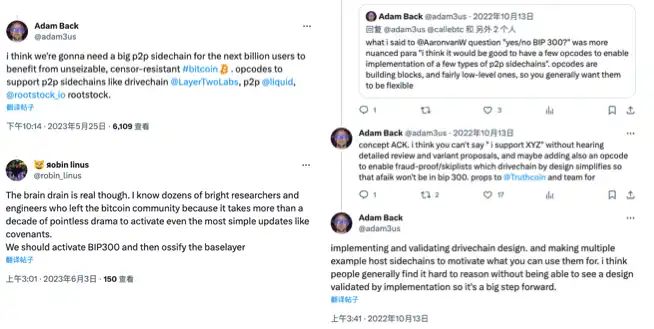 Adam Back 对 Drivechain 这种侧链形式表示赞赏:「向 Paul Sztorc 及其团队致敬,因为他们实现并验证了 Drivechain 设计。」他还认为 Drivechains 很酷,并且可以说比 Taproot 更重要或更有用。」他还提到:「我认为我们将需要一个大型 P2P 侧链,让下一个十亿用户从不可扣押的、抗审查的 #bitcoin 中受益。支持 P2P 侧链的操作码,如做 Drivechain 的 LayerTwoLabs、P2P 的 Liquidium、 Rootstock 。」