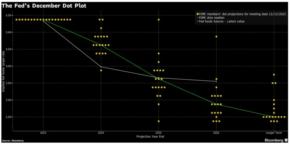 在 12 月初,鲍威尔警告市场不要对明年第一季度降息持有期待,他表示现在判断政策立场是否足够收紧,以及预测何时可能放松政策还为时过早。鲍威尔和其他政策制定者都同意,实现 2% 的通胀目标将是艰难的。政策制定者们承诺将利率保持在足够高的水平足够长的时间,以确保价格通胀回归目标,这导致市场参与者预期降息可能最早在三月出现。