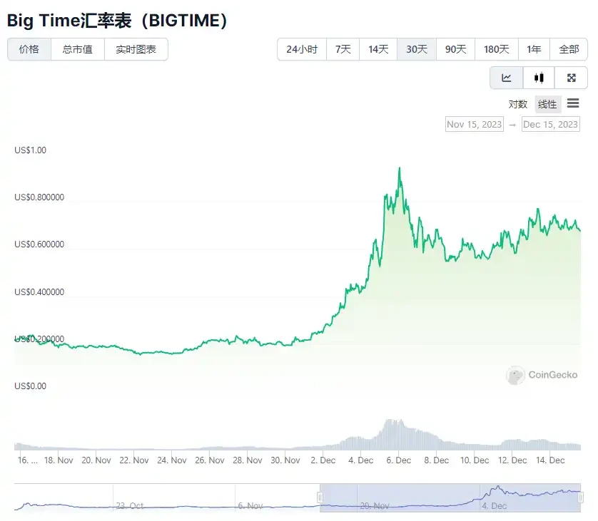 随着行情不断升温,以 BIGTIME 为代表的链游版块于 12 月 1 日正式点火起飞,短短 4 天币价最高拉升超 4 倍。截止发稿,BIGTIME 币价报 0.6782 美元,虽较高点小幅回落,但成交量保持高位。正如此前所讲,CEX 上币很重要的考量因素就是交投活跃程度。除此之外,作为时下链游版块最火热的炒作对象,新人不断入场链游,上架 BIGTIME 或许还将为 CEX 带来新的客源。