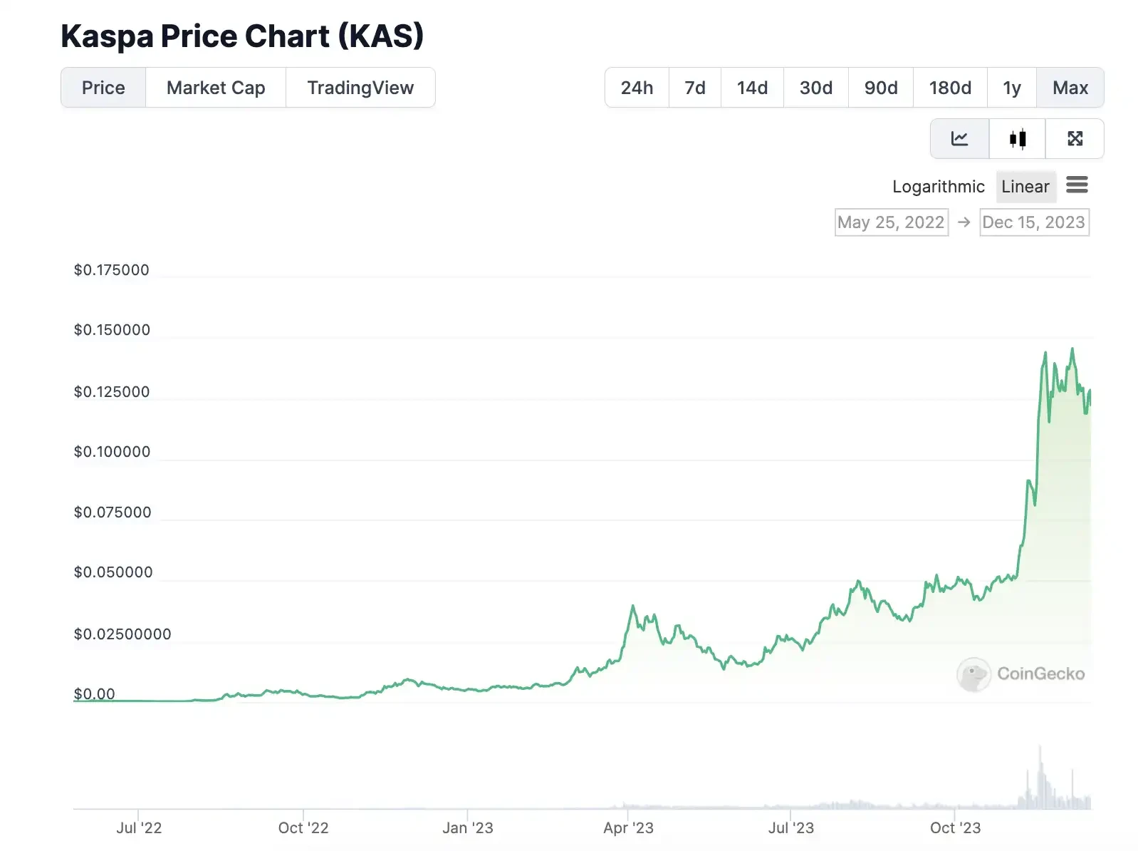 Kaspa 主网于 2021 年 11 月 7 日 正式启动,它使用 BlockDAG 架构来解决与传统区块链运行相关的可扩展性问题。KAS 挖矿算法为 kHeavyHash,支持 GPU 单挖或与 ETHW、ETC 双挖,支持部分 FPGA 和 ASIC 矿机挖矿。