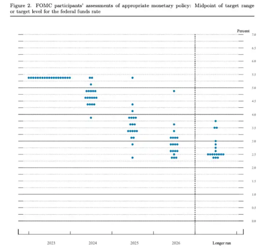 除了利率公告外,美联储同时披露了季度更新的经济预测。目前美联储预计2023年核心通胀率为 3.2%,而三个月前的预期为 3.7%,预计2024年的最终增长率为 2.4%,而之前为2.6%。