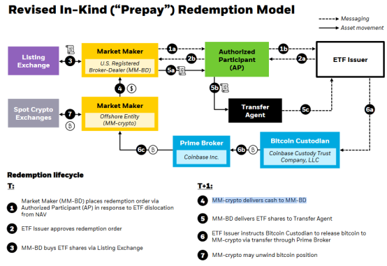 对此,贝莱德做出了修订,在实物赎回计划中添加了“预付费模式”,根据这一策略,做市商的离岸实体在ETF股票被赎回为比特币之前,用现金预付其位于美国的经纪交易商实体。经纪交易商可不通过自有资金参与交易,因而将风险更多转移至做市商。在此背景下,摩根大通或高盛等巨头企业也可充当授权参与者,以规避银行无法直接在资产负债表上持有比特币或加密货币的限制。
