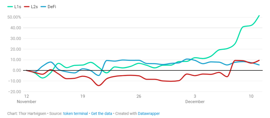 在上个牛市中,如 Solana、Avalanche、Fantom 和 Polygon 等 L1 的表现,在价格拉升方面非常出色。有人可能会认为,这种基础设施的主导地位是一个行业仍处于初期阶段的特征。