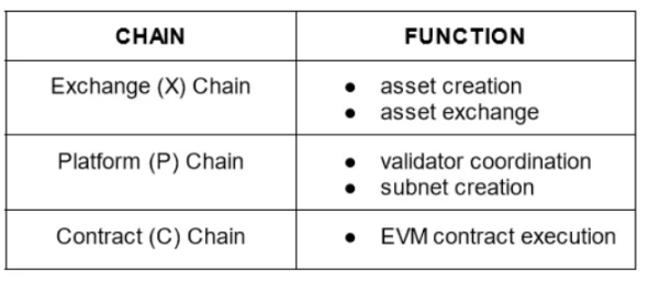 Avalanche 是一个快速且可扩展的平台,可让开发人员构建自定义区块链或使用现有子网(区块链的划分部分)。 Avalanche 主网络积极使用三个区块链,见下图所示。