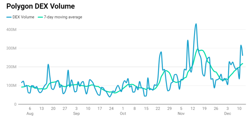 近几个月,Polygon DEX 的交易量略有增长,但其增长速度并不及 Solana 或 Avalanche。