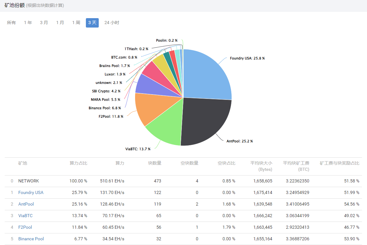 排名前三的矿池依然为 Foundry USA、AntPool 和 F 2 Pool ,占比分别为 29.81% 、 26.35% 和 11.23% 。如下所示: