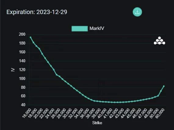 年底到期的 BTC 的波动率微笑曲线!各位老板们,你们有必要这么悲观么?左边看跌期权的波动率比右边高太多了!看跌期权的买方需求好大。