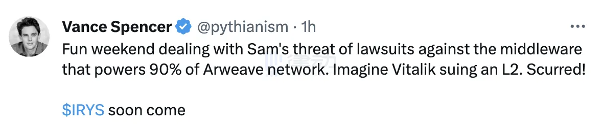 对于这次事件, Framework Ventures 联创 Vance Spencer ( @pythianism ) 发文 评论表示:「Sam 威胁要对支持 Arweave 网络 90% 的中间件提起诉讼,想象一下 Vitalik 起诉 L2。」