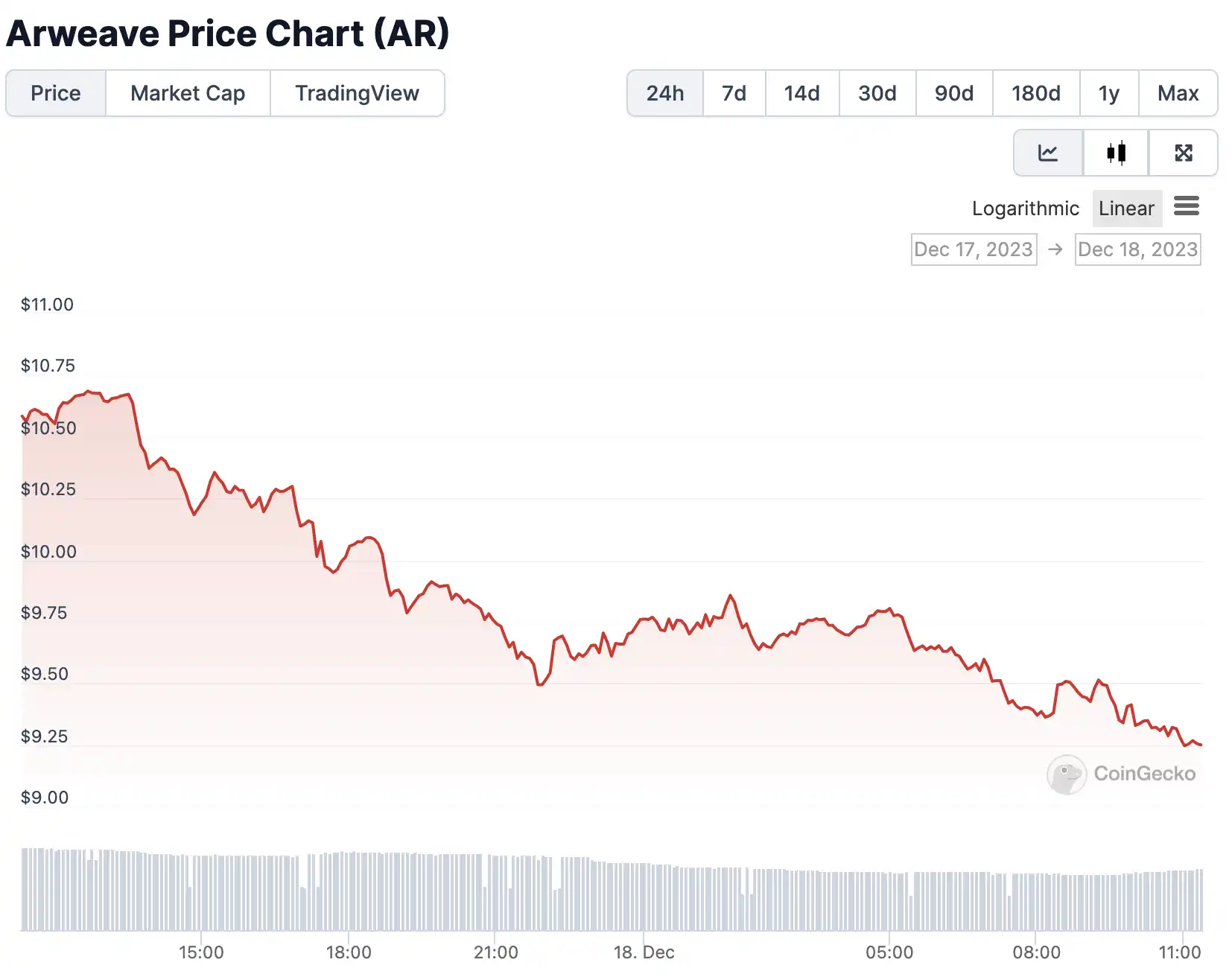据 CoinGecko 数据显示,在 Arweave 创始人 Sam Williams 发文后,Arweave 代币 AR 价格出现小幅下降, 1 小时下降 0.6% 、 24 小时跌幅达 12.3% ,截止发稿时报价 9.28 美元。
