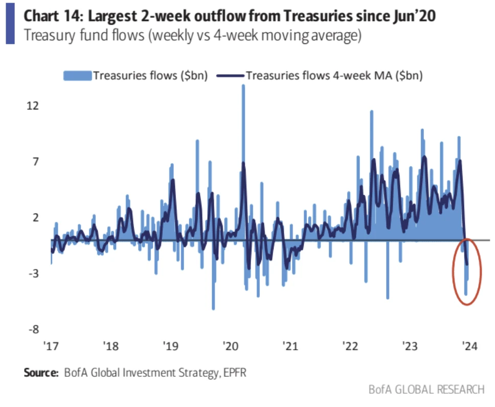 美国国债基金出现了 2020 年 6 月来最大的两周流出,尽管最近美债涨势凌厉,可以看到先入场的资金可能正在兑现: