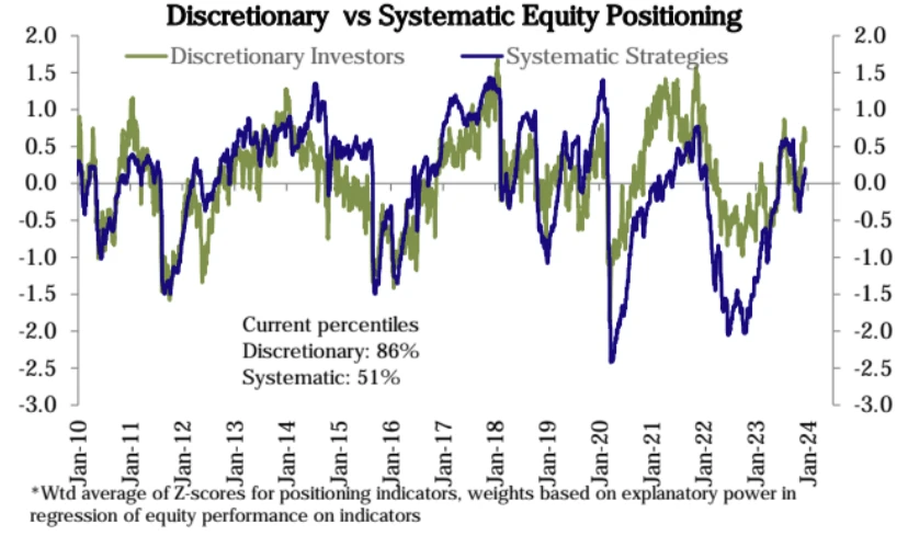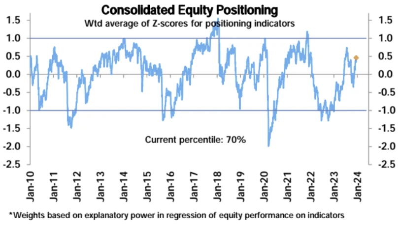 德意志银行的总股票头寸衡量指标本周再次上升,进一步进入超配区域(z-score 0.46 ,第 70 个百分位),高,但尚不极端