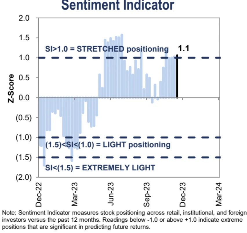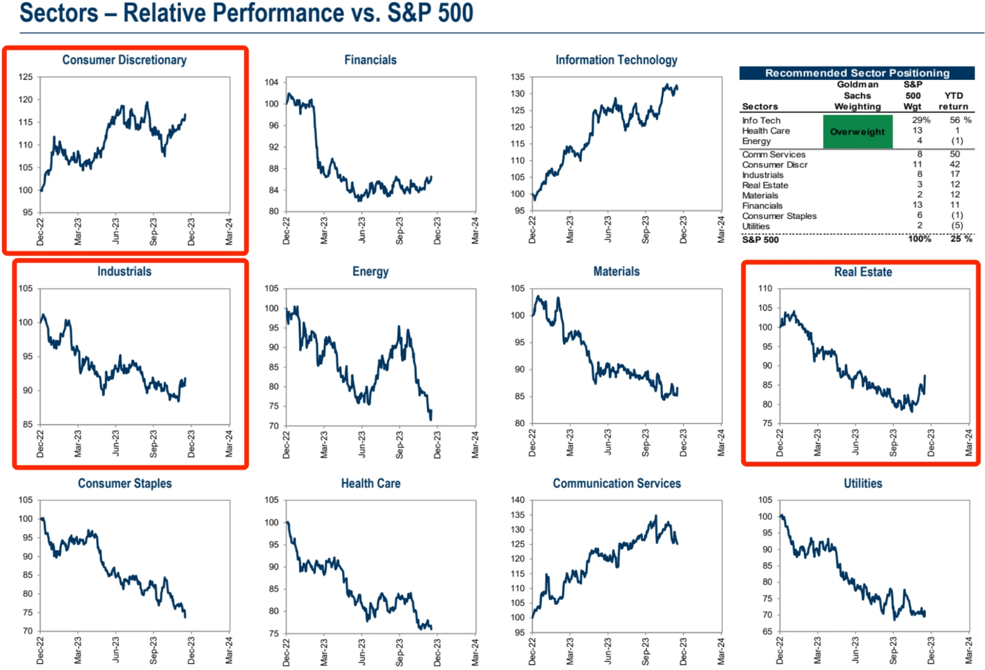 各大机构在会后也纷纷调降美债收益率曲线预测,对 10 Y 美债 24 年底预测值巴克莱是从 4.5% 降至 4.35% ,高盛是从 4.3% 降至 4% ,摩根大通是从 4.3% 降至 3.65% 。我们还看到了高盛直接把 SPX 明年底目标价大幅上调 8% 至 5100