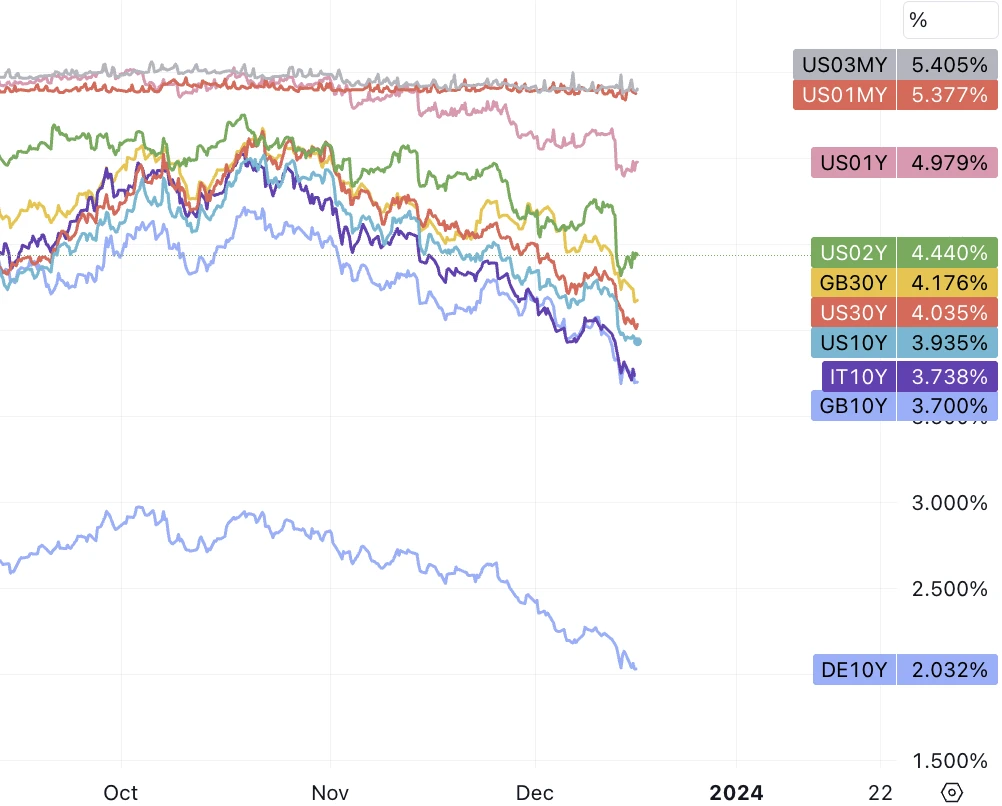 美国 30 年期国债收益率从 10 月份的多年高点 5.18% 上周跌破 4% 大关, 10 年期跌破 3.9% 关口。威廉姆斯和 Bostic 周五压制了部分市场的热情,但市场调整极为有限,凸显本次 Pivot 叙事仍在进行时。