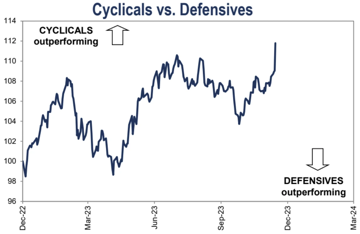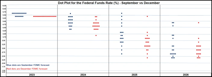 因为 12 月 1 日,鲍威尔还警告市场“现在猜何时开始宽松太早了”,而在 12 月 13 日的新闻发布上却称“开始讨论降息的问题”,所以这个鸽派转向是超出市场预期的,上周美股道指、纳斯达克 100 均创历史新高,标普 500 距离历史新高仅一步之遥。小盘代表罗素 2000 指数上周大涨 5.7% 距离历史高点仍相距 15% 以上。