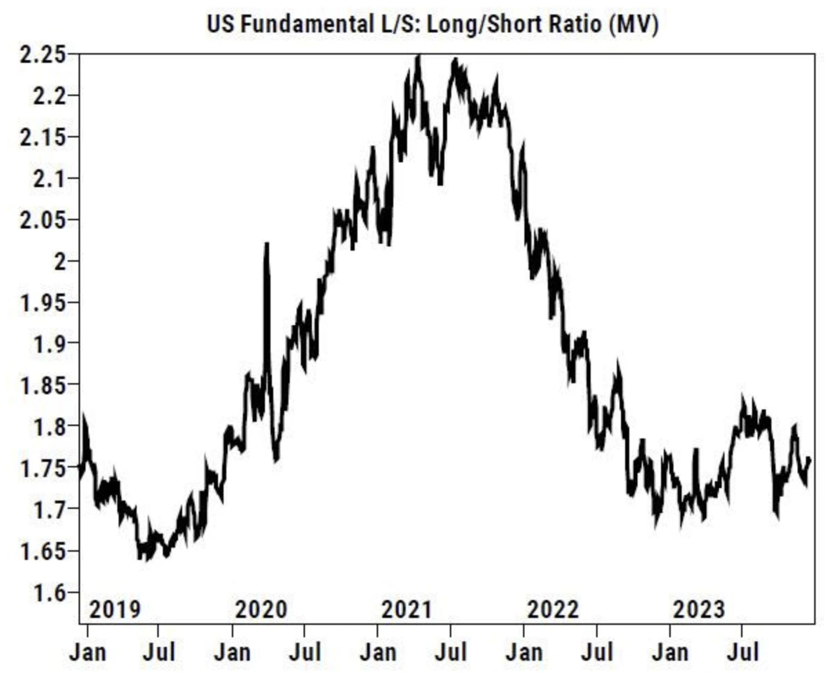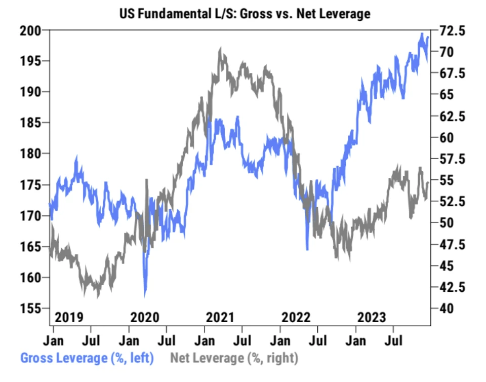 高盛客户交易数据,上周总杠杆率上升 2.4 个百分点,至 199.1% (三年历史里第 100 百分位),净杠杆率上升 0.9 个百分点,至 54.6% ( 48 百分位)多头/空头总体比率上涨 0.2% ,至 1.755 (25 百分位):