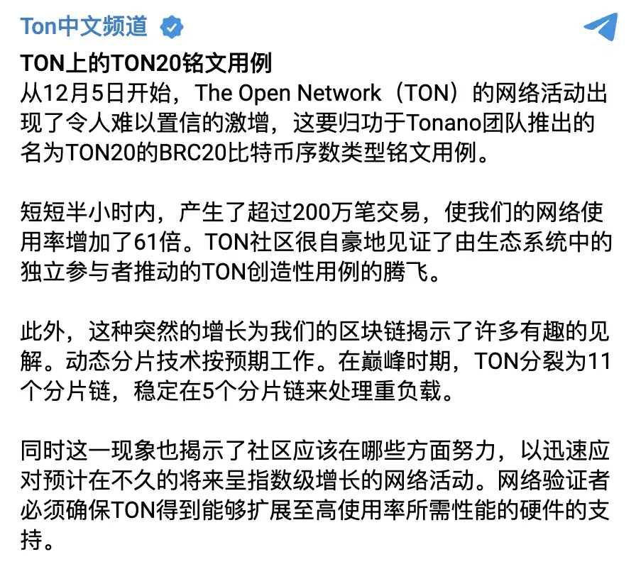 TON 铭文导致网络拥堵;图源:TON 中文官方频道
