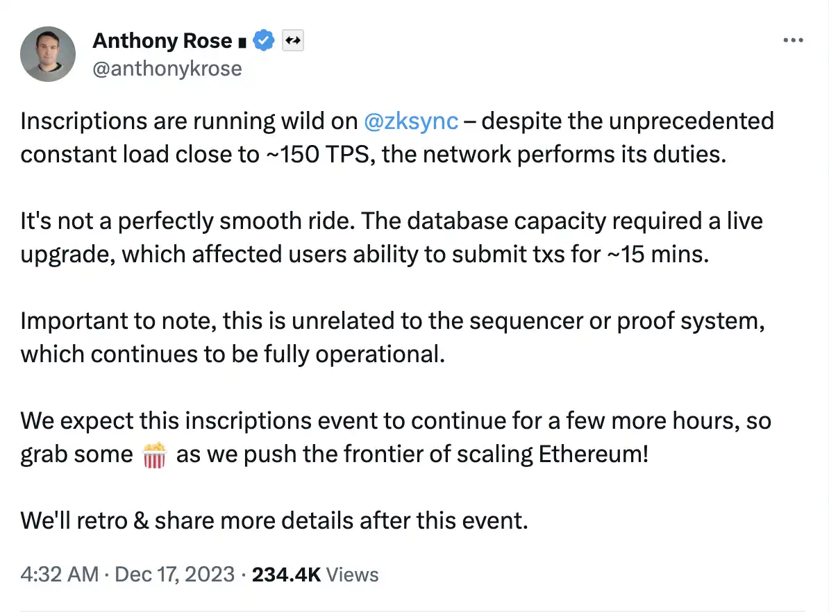 紧随其后的是另一大 Layer 2 zkSync, 12 月 17 日,在铸造 SYNC 铭文期间,zkSync 网络也出现短时「宕机」,区块链浏览器未显示出块,随后 zkSync 工程主管发布推文表示,在铸造过程中尽管达到了前所未有的 150 TPS,但网络仍履行其职责。