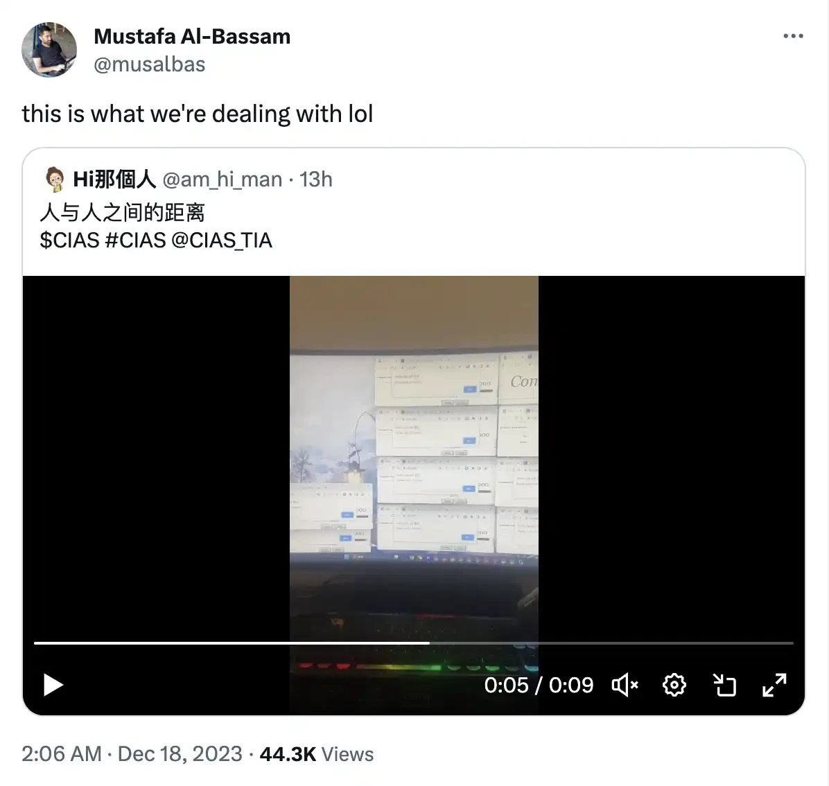 这突如其来的暂停铸币被社区称为「拔网线」,不过这并没有降低市场对 CIAS 的关注度。有人将科学家打 CIAS 的视频发布在社区,Celestia 创始人 Mustafa 转发视频称这是他们要解决的问题。