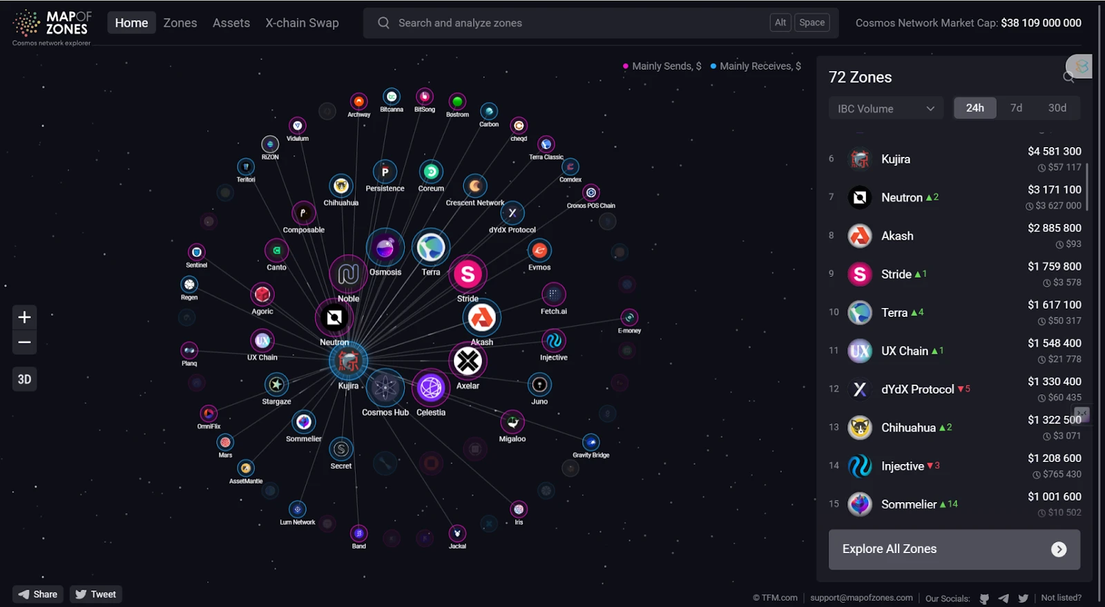 Kujira 在本年度发展势头较猛, 2023 年年初的 TVL 仅 3 M,截止写稿时已有 120.5 M,增长了将近 40 倍。和其竞争对手 Frax 和 Injective 相比,其 TVL 位居第二,和 Frax 相差 10 倍左右,但其市值以及 FDV 相差不大,反而 24 小时的交易量要超出 Frax。