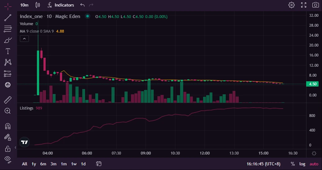 今天凌晨 3 点半左右,官方开始给中奖地址发放 NFT,开盘第一时间收到 NFT 的用户可以在 18 SOL 左右卖出。按照平均 2% 的中奖率来算成本大概在 2.5 SOL,单个 NFT 开盘收益率超 600% 。随着官方将 NFT 陆续发给中奖地址后,地板价一路下跌,跌至 4.5 SOL 附近,目前不足一倍的收益空间。