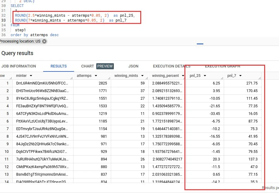目前来看,Analysoor 确实提供了近 25000 SOL 的 Offer 单兜底,兜底的价格也是平均下来的成本价格,尽可能做到让一级抽中奖的用户不亏钱。下图为官方给出参与抽奖次数靠前按照 7 SOL 与 2.5 SOL 出售的收益额情况。
