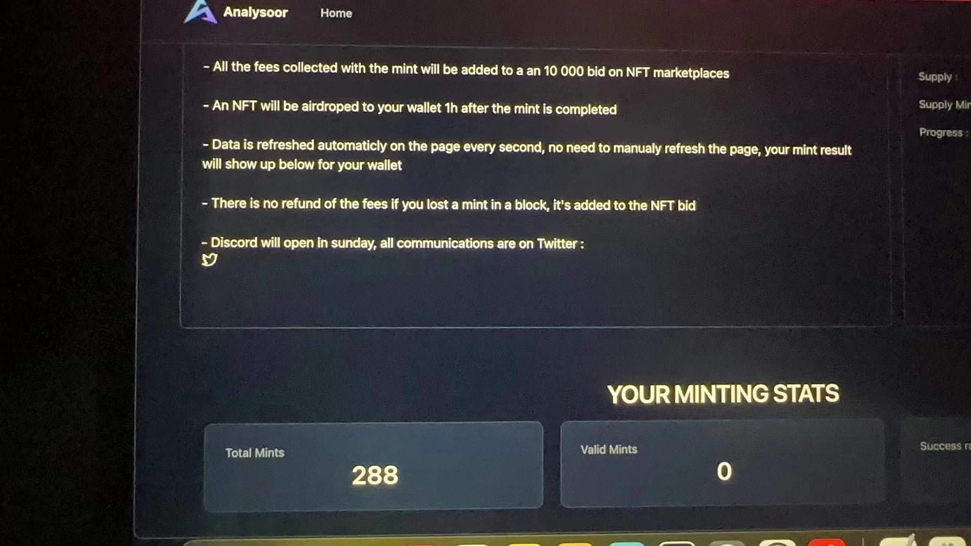 在看到社区的疯狂后,项目方不停发文强调,本次铸造持续一个半小时,提醒不需要着急 Mint、加 GAS 等操作进行。但社区 FOMO 的情绪持续高涨,大家拼命进行抽奖 Mint,花光钱包里的 SOL 一度成为了目标。