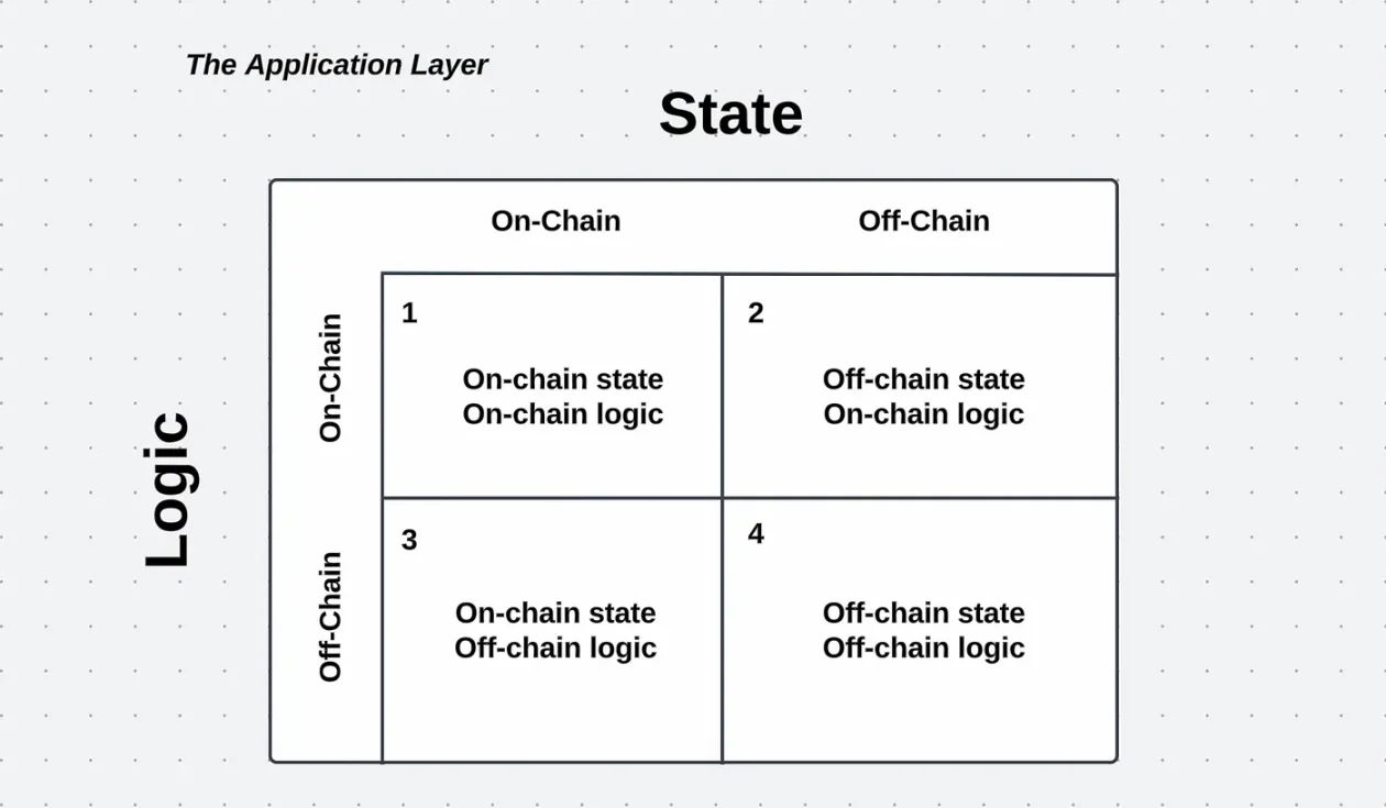 应用层有两个组件:状态和逻辑。状态就是数据;逻辑就是计算。状态和逻辑都可以在链上或链下。我们给出了一个四象限矩阵:
