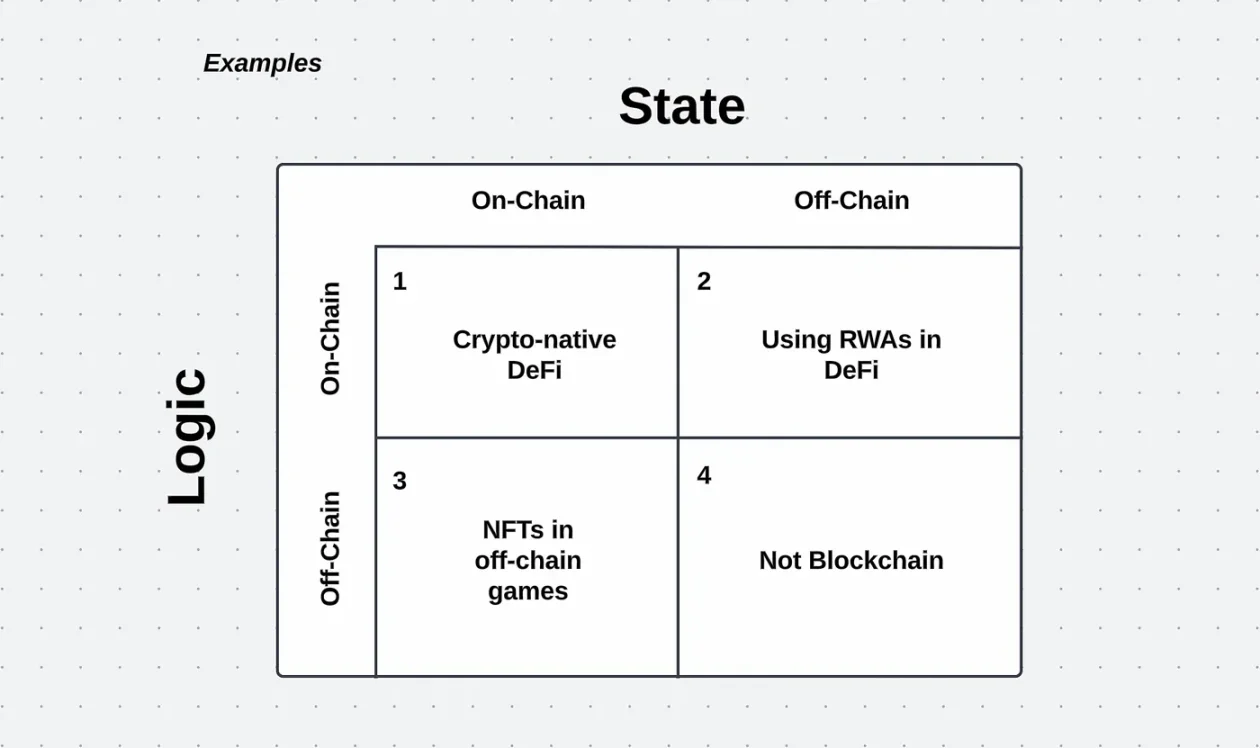 每个象限都有不同的应用。迄今为止,大多数区块链应用都处于第一象限,它代表我们在链上协议中使用加密原生资产。第二象限涉及将现实世界的资产引入链上并在协议中使用它们。第三象限涵盖了我们在链外使用加密原生资产的情况。剩下其他的一切都属于第四象限。如果状态和逻辑都不是链上的,那么它就不是区块链应用程序。
