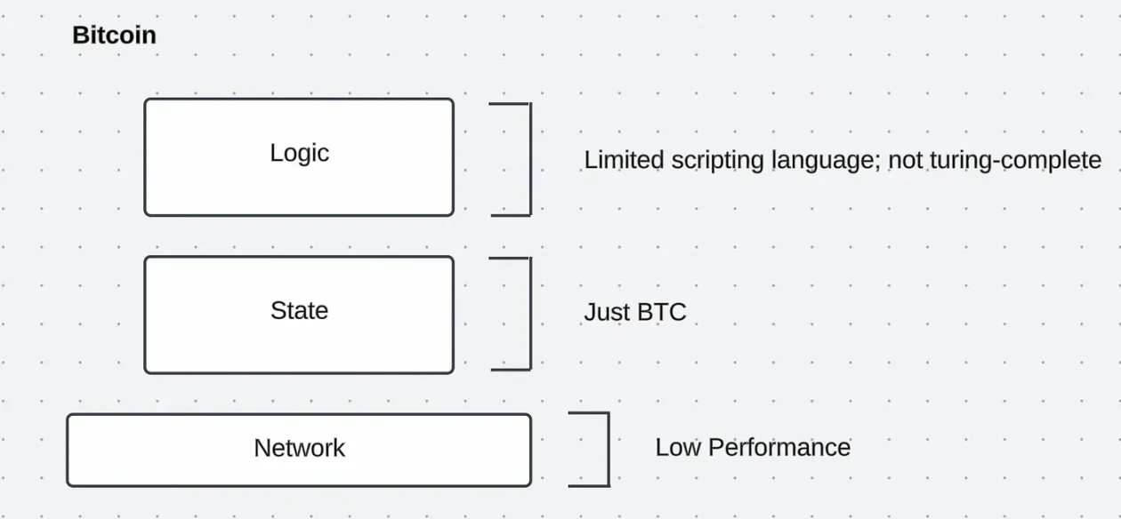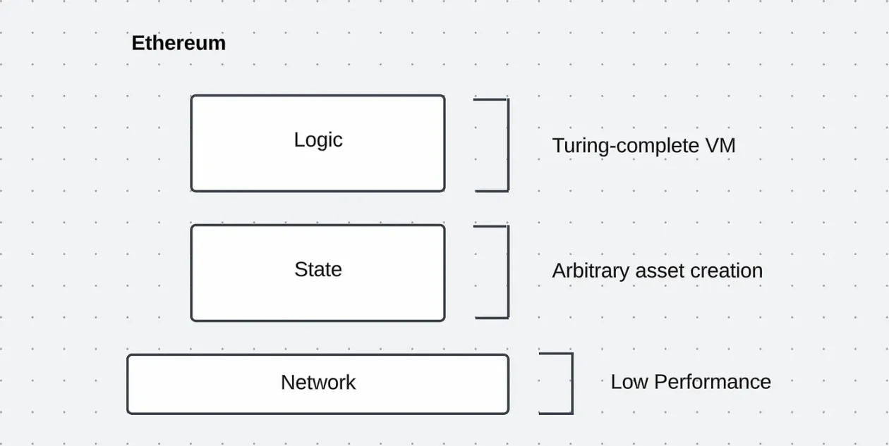 然后是以太坊,它通过新的区块链原生虚拟机引入了灵活的逻辑层。它还允许任何人在同一网络上创建自己的加密资产。以太坊因此扩展了状态层和逻辑层。