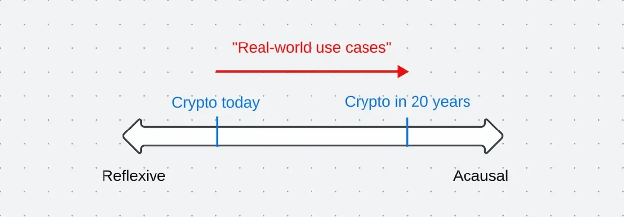 现实世界的用例削弱了加密经济的反身性。随着时间的推移,市场将变得更加非因果。我们所说的「非因果」是指对区块链应用程序的需求并非来自区块链本身的内生需求——我们认为这是我们能找到的最接近「反身」反义词的词语。