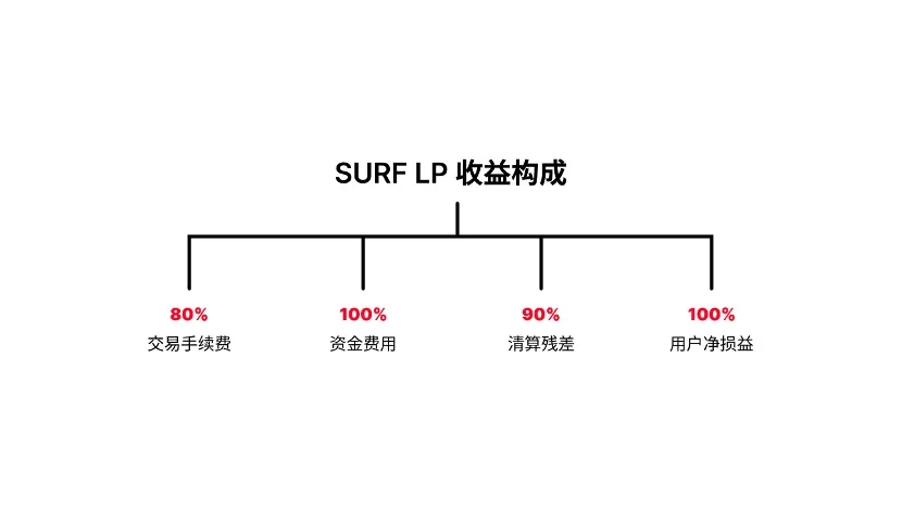 提供流动性的本质是成为交易者的对手方,因此关键问题在于如何确保经济激励的有效性。在 Surf 上,LP 可以获得至少 80% 的交易手续费、 100% 的资金费率、 90% 的清算残差和 100% 的用户净损益,这些收益确保了长期情况下 LP 具有正的数学期望,以补偿自己所承担的风险。同时,由于经营 LP 有着巨大的利益,每一个新资产的 LP 有动力去吸引更多的用户加入自己创建的池子的交易对来完成利益最大化。