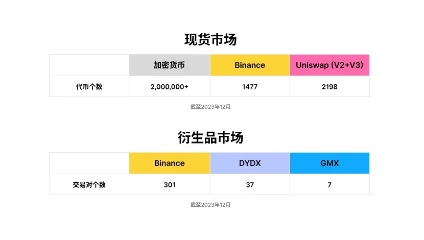 去中心化衍生品的潜力仍没有被彻底开发。 据 Coinmarketcap 数据,截至 2023 年 12 月,已发行的加密货币已经超过 200 万种,其中最大的 Binance 共开通了 394 种代币的 1477 个交易对,而最大的去中心化交易所 Uniswap 提供了至少 2198 个活跃的交易对(v2+v3)。