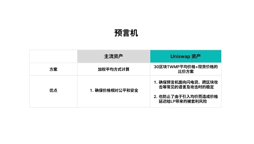 任何衍生品解决方案都无法绕靠预言机与清算问题,在 Sur Protocl 当中同样存在。在主流资产方面,Surf 采用了常见的加权平均方式计算,确保价格相对公平和安全;针对 Uniswap 的资产,Surf 创新的提出了 30 区块 TWMP 平均价格+现货价格的比价方案,确保预言机面向闪电贷、跨区块攻击等常见的语言及攻击时的稳定性,也防止了由于引入均价而造成价格延迟给 LP 带来的被套利风险。