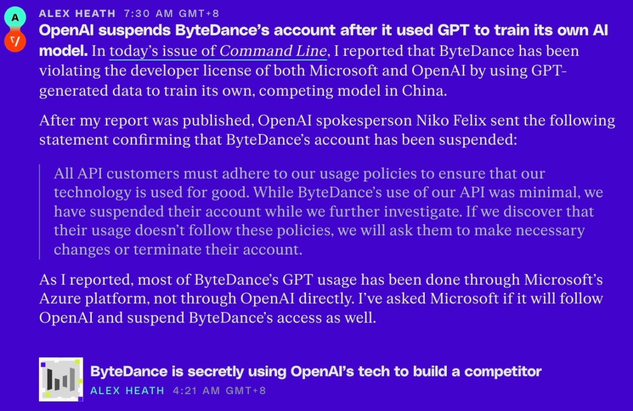 就在上周末,字节跳动也被OpenAI禁止使用API接口,原因也是因为说字节在使用GPT训练自己的AI,违反了使用条例。