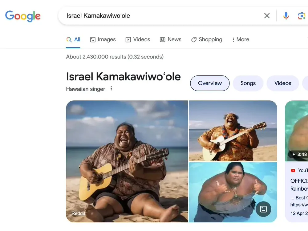就在上个月,一些网友发现,在谷歌搜索上输入已故夏威夷歌手Israel Kamakawiwo’ole的名字是,得到的搜索结果,前几张图片都是有AI生成的,而并非真实照片,并且这是一位以弹奏尤克里里而闻名的音乐家,但图片里的他却在弹吉他。