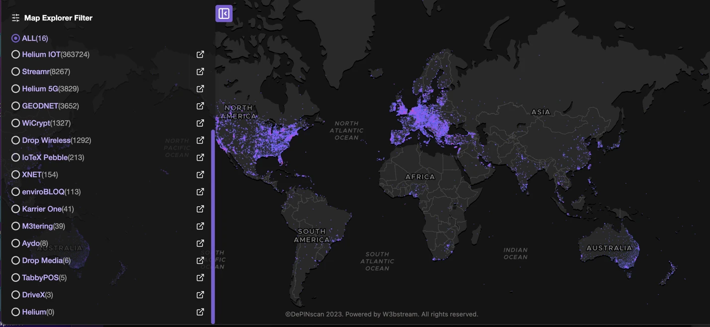除了 Solana 生态上的 DePin, 其他生态中也有生态和项目发展较成熟的项目,包括上文和 Honey(Hivemapper)进行对比的 Dimo, IOTX(IOTEX), Streamr ( DATA ), WIFI Map(WIFI)等。从 Depinscan 提供的热点分布图可以看出,Helium 生态(IOT, 5 G)热点分布最广泛,Helium IOT 有 363 k 的设备部署,Helium 5 有 38 k, 其次是 Streamr 部署了 83 k 设备。