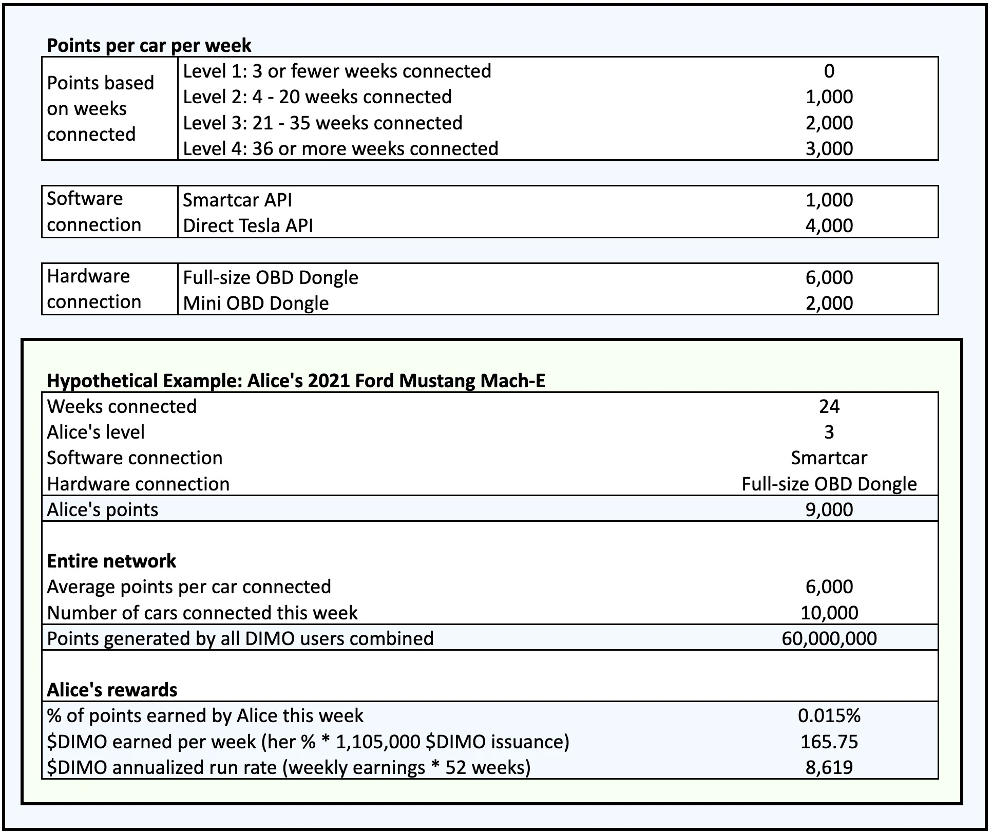 代币分布来看,DIMO 总供应量为 10 亿,baseline rewards 占比 38% , 3.8 亿枚 DIMO 将会在 40 年内进行分配,第一年每周向用户发行 1, 105, 000 DIMO,每个用户获得的挖矿奖励根据下图规则分发,发行量每年减少 15% ;Dimo 国库占比 22% ,为网络做出贡献的团队和个人可能会以赏金或赠款的形式收到 $DIMO;团队占比 22% ,代币分配将受到两年的锁定,然后每月线性解锁,直至三年后全部解锁完毕;投资者占比 8% ,代币分配将受到两年的锁定,然后每月线性解锁,直至三年后全部解锁完毕;空投占比 7% ;
