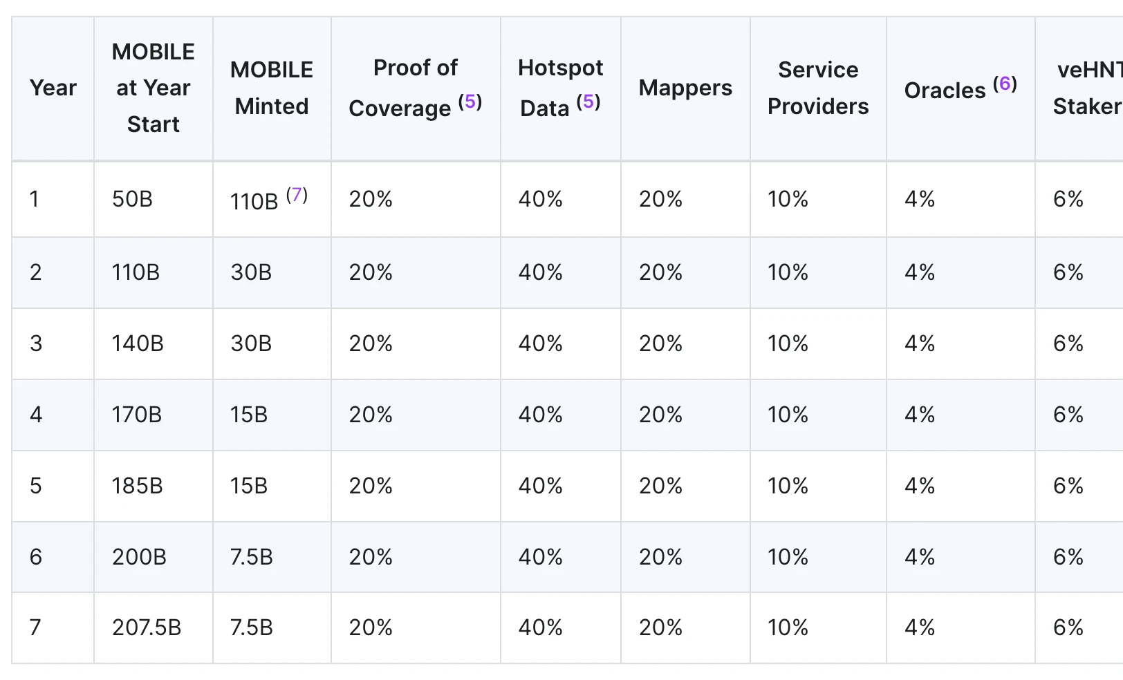 MOBILE 代币通过 5 G-CBRS 和 WiFi 热点进行挖矿,既包括数据传输所得,也包括覆盖证明。代币分配 MOBILE 遵循与 HNT 类似的铸币计划,但最大供应量为 230, 000, 000, 000 (230 B)。在移动网络启动时,预铸了 50 B MOBILE 并分配给由 Helium Foundation 管理的网络运营基金。此分配的一部分在创世期间分发给活跃的 Mobile Network 热点。MOBILE 的第一年始于 2022 年 8 月 1 日,第一批代币于 2022 年 8 月 12 日铸造。