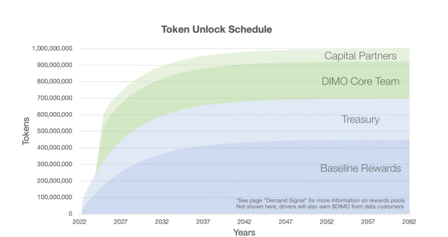 目前流通 194 mln(其中包括空投的 70 mln, baseline rewards 已经分发的 57 mln, 以及 67 mln 分配给国库),最初的空投实际上是对 baseline rewards(理解为挖矿收入)的大规模分发(70 mln),剩余 382, 491, 185 $DIMO。该池将在 40 年内分发,首年每周向用户发行 1, 00, 1050 $DIMO,每年减少 15% 。从筹码结构来看是较好的。