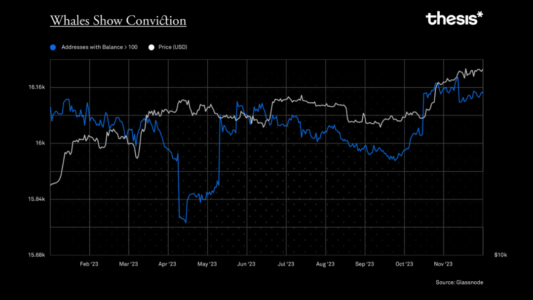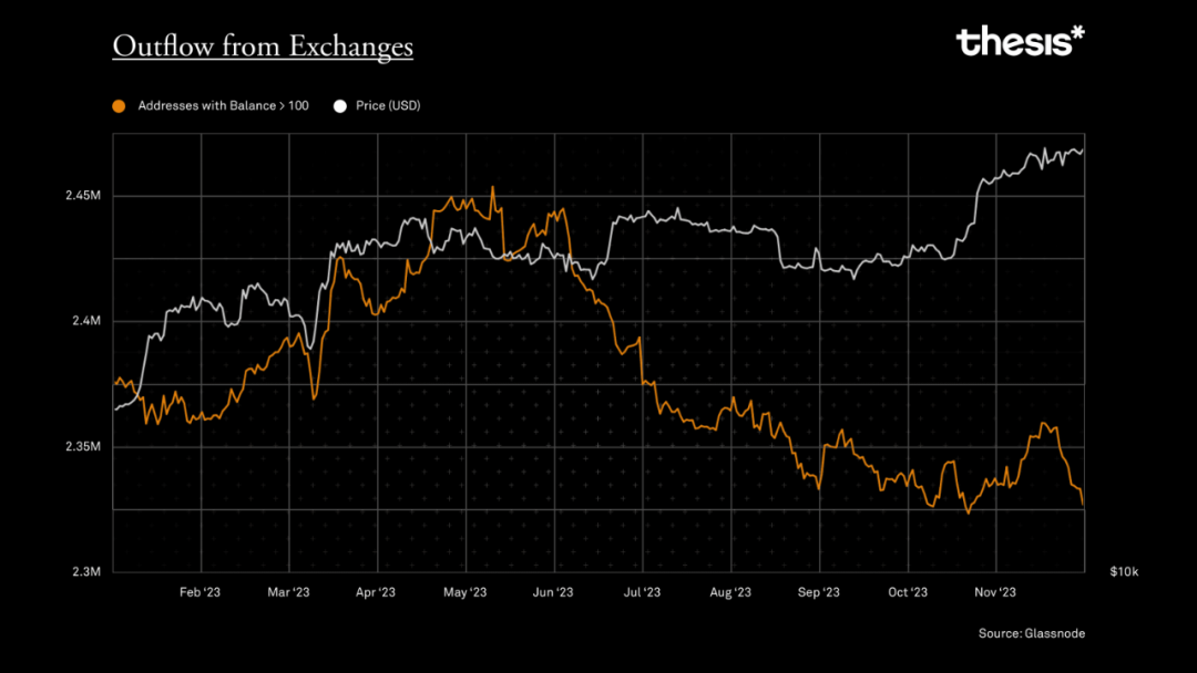 值得注意的是,撤回自托管地址数量持续上升,而交易所余额却持续下降。这种差异,加上价格盘整期间长期持有者的净积累,表明人们对比特币作为投资和价值储存的持久信心。价格大幅上涨之前往往是大量积累的时期。这些数据说明两个重要概念 -- 在动荡的市场中持有者信念的重要性,以及比特币无弹性供应曲线的优点。随着大型机构实体对比特币供应的整合,即使在价格较高情况下出售比特币的动力也会减弱。这种供应挤压以及主流机构兴趣的增加为推动周期性牛市创造了必要的先决条件。